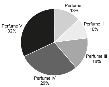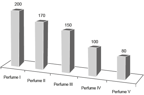 O gerente de uma loja de cosméticos colocou à venda cinco diferentes tipos de perfume, tendo em estoque na loja as mesmas quantidades de cada um deles. O setor de controle de estoque encaminhou ao gerente registros gráficos descrevendo os preços unitários de cada perfume, em real, e a quantidade vendida de cada um deles, em percentual, ocorrida no mês de novembro.