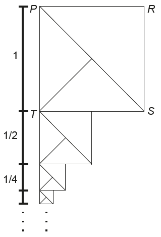 O quadrado PRST, com lado de medida 1, é o ponto de partida. O segundo quadrado é construído sob ele tomando-se o ponto médio da base do quadrado anterior e criando-se um novo quadrado, cujo lado corresponde à metade dessa base. Essa sequência de construção se repete recursivamente.