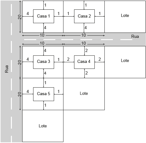 A imagem apresenta um esquema, sem escala, no qual estão representados os lotes, as ruas e os afastamentos considerados nos projetos entre as casas e as divisas dos lotes. As medidas indicadas no esquema estão expressas em metro.