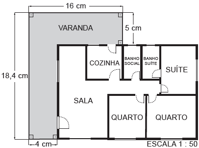 Uma empresa de engenharia projetou uma casa com a forma de um retângulo para um de seus clientes. Esse cliente solicitou a inclusão de uma varanda em forma de L. A figura apresenta a planta baixa desenhada pela empresa, já com a varanda incluída, cujas medidas, indicadas em centímetro, representam os valores das dimensões da varanda na escala de 1 : 50.