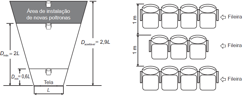 - Distância máxima (Dmáx) entre a tela de projeção e o encosto da poltrona da última fileira deve ser o dobro da largura (L) da tela, sendo aceitável uma distância de até 2,9 vezes a largura (L) da tela.