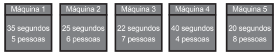 Em um aeroporto, os passageiros devem submeter suas bagagens a uma das cinco máquinas de raio-X disponíveis ao adentrarem a sala de embarque. Num dado instante, o tempo gasto por essas máquinas para escanear a bagagem de cada passageiro e o número de pessoas presentes em cada fila estão apresentados em um painel, como mostrado na figura.