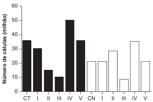 Em uma pesquisa estão sendo testados cinco quimioterápicos quanto à sua capacidade antitumoral. No entanto, para o tratamento de pacientes, sabe-se que é necessário verificar também o quanto cada composto agride células normais. Para o experimento, partiu-se de cultivos de células tumorais (colunas escuras na figura) e células normais (colunas claras) com o mesmo número de células iniciais. Dois grupos-controle não receberam quimioterápicos: controle de células tumorais (CT) e de células normais (CN). As colunas I, II, III, IV e V correspondem aos grupos tratados com os cinco compostos. O número de células viáveis após os tratamentos está representado pelas colunas.