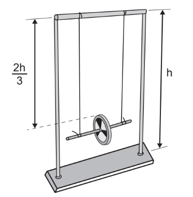 Ao preparar a segunda etapa, ele considera a aceleração da gravidade igual a 10 ms−2 e a velocidade linear do centro de massa do disco desprezível em comparação com a velocidade angular. Em seguida, mede a altura do topo do disco em relação ao chão no ponto mais baixo de sua trajetória, obtendo $\cfrac{1}{3}$ da altura da haste do brinquedo.