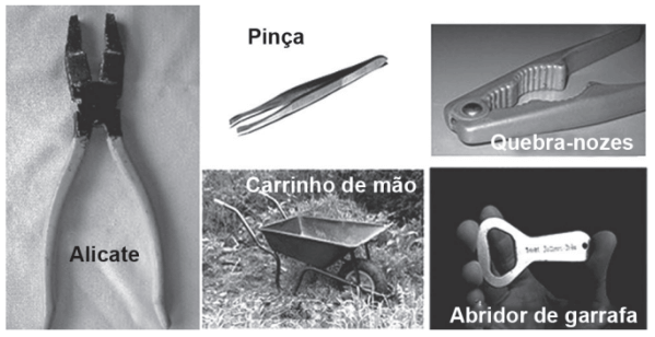 As pessoas que utilizam objetos cujo princípio de funcionamento é o mesmo do das alavancas aplicam uma força, chamada de força potente, em um dado ponto da barra, para superar ou equilibrar uma segunda força, chamada de resistente, em outro ponto da barra. Por causa das diferentes distâncias entre os pontos de aplicação das forças, potente e resistente, os seus efeitos também são diferentes. A figura mostra alguns exemplos desses objetos.