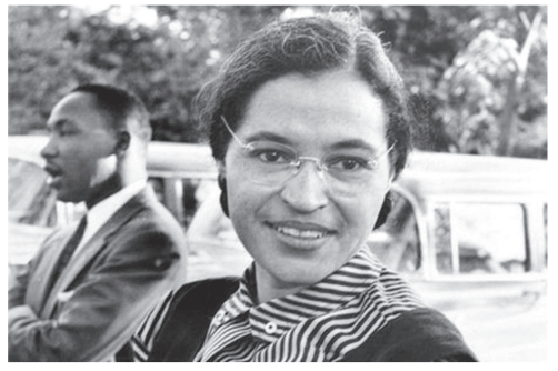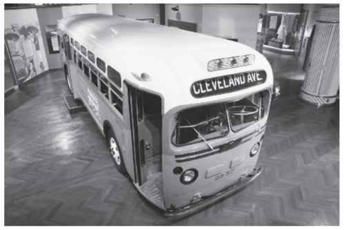 Esse ônibus relaciona-se ao ato praticado, em 1955, por Rosa Parks, apresentada em fotografia ao lado de Martin Luther King. O veículo alcançou o estatuto de obra museológica por simbolizar o(a)