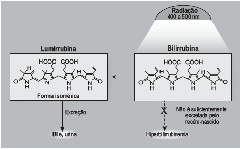 A icterícia, popularmente conhecida por amarelão, é uma patologia frequente em recém-nascidos. Um bebê com icterícia não consegue metabolizar e excretar de forma eficiente a bilirrubina. Com isso, o acúmulo dessa substância deixa-o com a pele amarelada. A fototerapia é um tratamento da icterícia neonatal, que consiste na irradiação de luz no bebê. Na presença de luz, a bilirrubina é convertida no seu isômero lumirrubina que, por ser mais solúvel em água, é excretada pela bile ou pela urina. A imagem ilustra o que ocorre nesse tratamento.