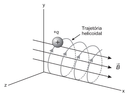 O espectrômetro de massa de tempo de voo é um dispositivo utilizado para medir a massa de íons. Nele, um íon de carga elétrica q é lançado em uma região de campo magnético constante $\vec{B}$, descrevendo uma trajetória helicoidal, conforme a figura. Essa trajetória é formada pela composição de um movimento circular uniforme no plano yz e uma translação ao longo do eixo x. A vantagem desse dispositivo é que a velocidade angular do movimento helicoidal do íon é independente de sua velocidade inicial. O dispositivo então mede o tempo t de voo para N voltas do íon. Logo, com base nos valores q, B, N e t, pode-se determinar a massa do íon.