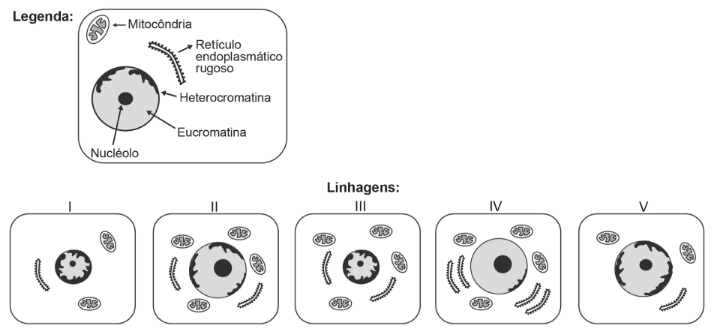 O nível metabólico de uma célula pode ser determinado pela taxa de síntese de RNAs e proteínas, processos dependentes de energia. Essa diferença na taxa de síntese de biomoléculas é refletida na abundância e características morfológicas dos componentes celulares. Em uma empresa de produção de hormônios proteicos a partir do cultivo de células animais, um pesquisador deseja selecionar uma linhagem com o metabolismo de síntese mais elevado, dentre as cinco esquematizadas na figura.
