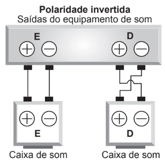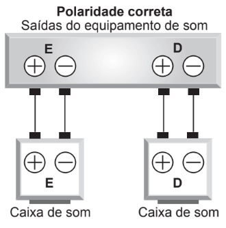 Nos manuais de instalação de equipamentos de som há o alerta aos usuários para que observem a correta polaridade dos fios ao realizarem as conexões das caixas de som. As figuras ilustram o esquema de conexão das caixas de som de um equipamento de som mono, no qual os alto-falantes emitem as mesmas ondas. No primeiro caso, a ligação obedece às especificações do fabricante e no segundo mostra uma ligação na qual a polaridade está invertida.