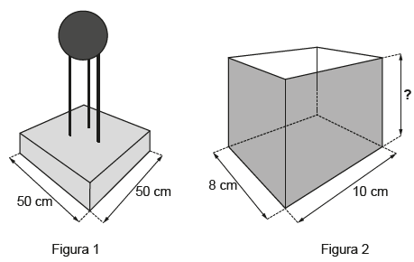 Para retirar o objeto de dentro do recipiente, a altura da coluna de água deve ser de, pelo menos, 15 cm. Para a coluna de água chegar até essa altura, é necessário colocar dentro do recipiente bolinhas de volume igual a 6 cm3 cada, que ficarão totalmente submersas.
