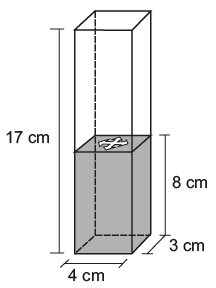 Num recipiente com a forma de paralelepípedo reto-retângulo, colocou-se água até a altura de 8 cm e um objeto, que ficou flutuando na superfície da água.