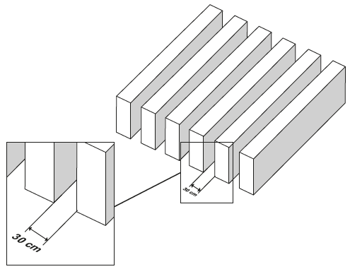 Um arquiteto projeta um pergolado com vãos de 30 cm de distância entre suas vigas, de modo que, no solstício de verão, a trajetória do sol durante o dia seja realizada num plano perpendicular à direção das vigas, e que o sol da tarde, no momento em que seus raios fizerem 30° com a posição a pino, gere a metade da luz que passa no pergolado ao meio-dia.