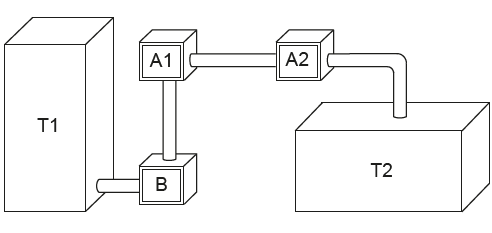 Um processo de aeração, que consiste na introdução de ar num líquido, acontece do seguinte modo: uma bomba B retira o líquido de um tanque T1 e o faz passar pelo aerador A1, que aumenta o volume do líquido em 15%, e em seguida pelo aerador A2, ganhando novo aumento de volume de 10%. Ao final, ele fica armazenado num tanque T2, de acordo com a figura.