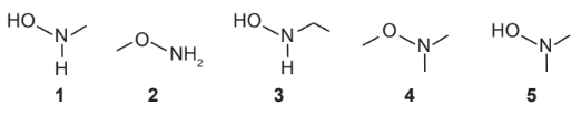 O produto A é favorecido em relação ao B, por um fator de 105. Em um estudo de possível substituição do uso de hidroxilamina, foram testadas as móleculas numeradas de 1 a 5 .
