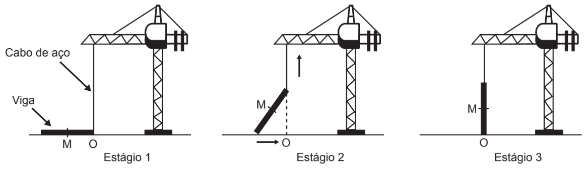 Os guindastes são fundamentais em canteiros de obras, no manejo de materiais pesados como vigas de aço. A figura ilustra uma sequência de estágios em que um guindaste iça uma viga de aço que se encontra inicialmente no solo.