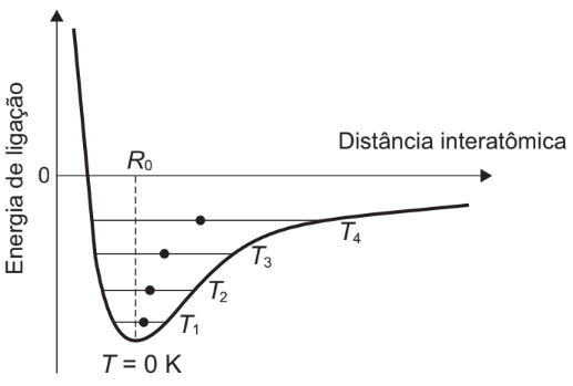 Alguns materiais sólidos são compostos por átomos que interagem entre si formando ligações que podem ser covalentes, iônicas ou metálicas. A figura apresenta a energia potencial de ligação em função da distância interatômica em um sólido cristalino. Analisando essa figura, observa-se que, na temperatura de zero kelvin, a distância de equilíbrio da ligação entre os átomos (R0) corresponde ao valor mínimo de energia potencial. Acima dessa temperatura, a energia térmica fornecida aos átomos aumenta sua energia cinética e faz com que eles oscilem em torno de uma posição de equilíbrio média (círculos cheios), que é diferente para cada temperatura. A distância de ligação pode variar sobre toda a extensão das linhas horizontais, identificadas com o valor da temperatura, de T1 a T4 (temperaturas crescentes).