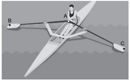 Nessa posição, os dois remos se encontram no ponto A e suas outras extremidades estão indicadas pelos pontos B e C. Esses três pontos formam um triângulo ABC cujo ângulo BÂC tem medida de 170°.