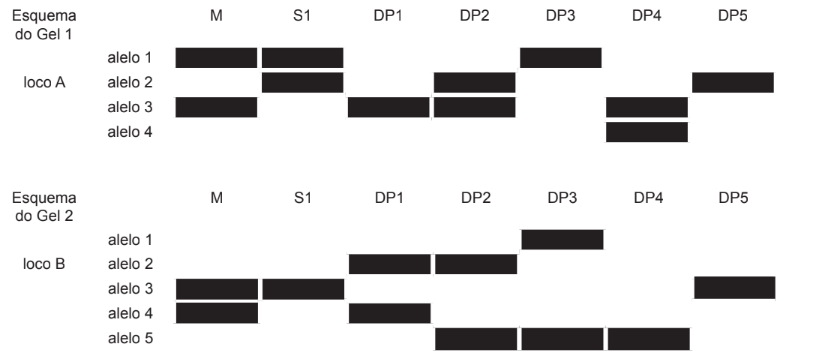 Considere, em um fragmento ambiental, uma árvore matriz com frutos (M) e outras cinco que produziram flores e são apenas doadoras de pólen (DP1, DP2, DP3, DP4 e DP5). Foi excluída a capacidade de autopolinização das árvores. Os genótipos da matriz, da semente (S1) e das prováveis fontes de pólen foram obtidos pela análise de dois locos (loco A e loco B) de marcadores de DNA, conforme a figura.