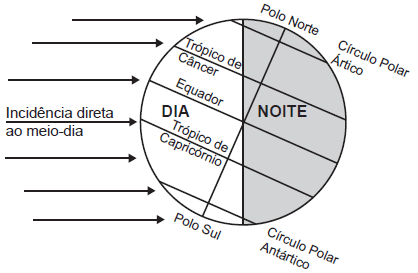 O eixo de rotação da Terra apresenta inclinação em relação ao plano de sua órbita em torno do Sol, interferindo na duração do dia e da noite ao longo do ano.