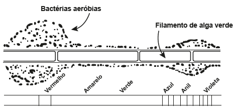 Em uma aula sobre metabolismo energético, foi apresentado um experimento clássico realizado por Engelmann. Um recipiente contendo bactérias aeróbias e uma alga verde filamentosa foi submetido à iluminação de uma fonte de luz, representada pelo microespectro. Após a explicação, um aluno esquematizou na lousa o resultado do referido experimento.