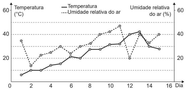 Um resumo da previsão do tempo nessa cidade, para um período de 15 dias, foi apresentado no gráfico.