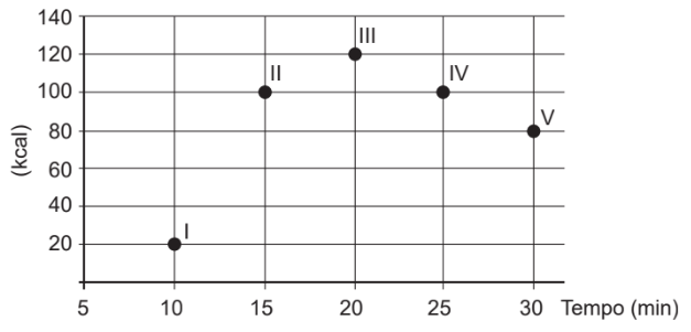 Os exercícios físicos são recomendados para o bom funcionamento do organismo, pois aceleram o metabolismo e, em consequência, elevam o consumo de calorias. No gráfico, estão registrados os valores calóricos, em kcal, gastos em cinco diferentes atividades físicas, em função do tempo dedicado às atividades, contado em minuto.
