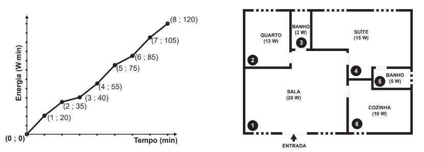 O morador dessa casa visitou alguns desses cômodos, ficando exatamente um minuto em cada um deles. O gráfico descreve o consumo acumulado de energia, em watt × minuto, em função do tempo t, em minuto, das lâmpadas de LED dessa casa, enquanto a figura apresenta a planta baixa da casa, na qual os cômodos estão numerados de 1 a 6, com as potências das respectivas lâmpadas indicadas.