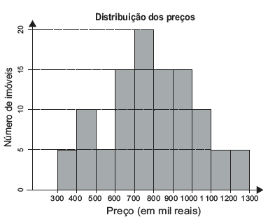 O gráfico ilustra a distribuição de frequências dos preços de venda dos apartamentos dessa lista (em mil reais), no qual as faixas de preço são dadas por ]300, 400], ]400, 500], ]500, 600], ]600, 700], ]700, 800], ]800, 900], ]900, 1 000], ]1 000, 1 100], ]1 100, 1 200] e ]1 200, 1 300].