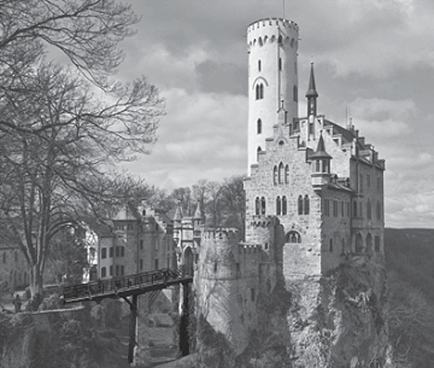 Um parque temático brasileiro construiu uma réplica em miniatura do castelo de Liechtenstein. O castelo original, representado na imagem, está situado na Alemanha e foi reconstruído entre os anos de 1840 e 1842, após duas destruições causadas por guerras.