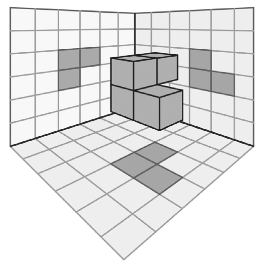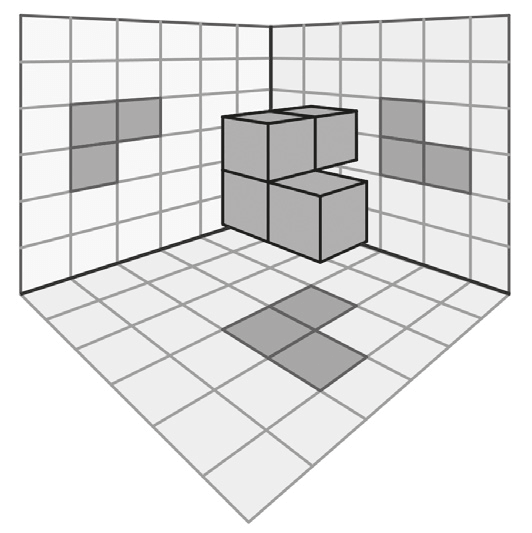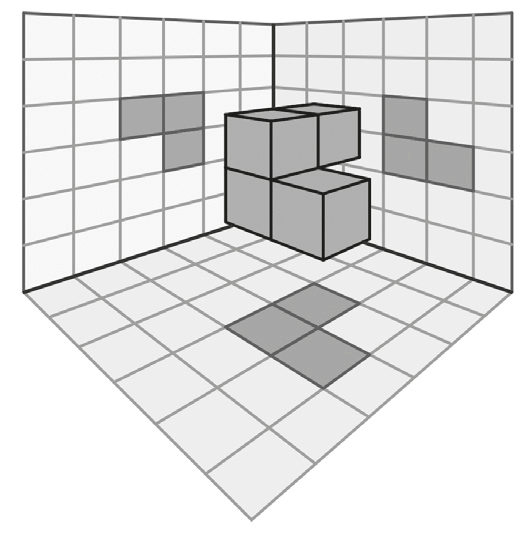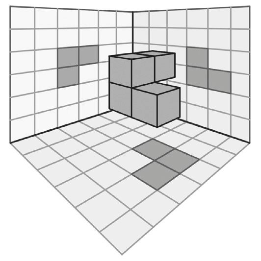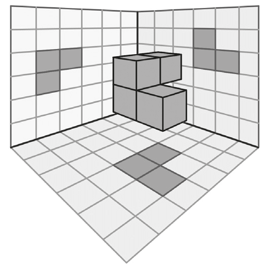 Em um jogo desenvolvido para uso no computador, objetos tridimensionais vão descendo do alto da tela até alcançarem o plano da base. O usuário pode mover ou girar cada objeto durante sua descida para posicioná-lo convenientemente no plano horizontal. Um desses objetos é formado pela justaposição de quatro cubos idênticos, formando assim um sólido rígido, como ilustrado na figura.