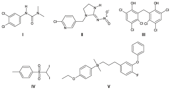 As águas subterrâneas têm sido contaminadas pelo uso de pesticidas na agricultura. Entre as várias substâncias usualmente encontradas, algumas são apresentadas na figura. A distinção dessas substâncias pode ser feita por meio de uma análise química qualitativa, ou seja, determinando sua presença mediante a adição de um reagente específico. O hidróxido de sódio é capaz de identificar a presença de um desses pesticidas pela reação ácido-base de Brönsted-Lowry.