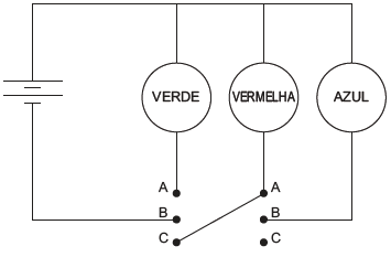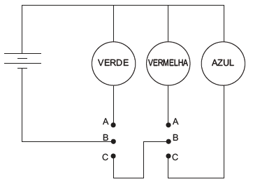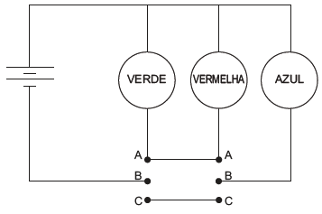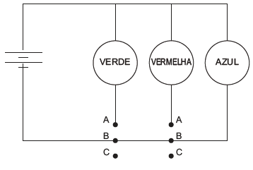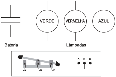 Um garoto precisa montar um circuito que acenda três lâmpadas de cores diferentes, uma de cada vez. Ele dispõe das lâmpadas, de fios, uma bateria e dois interruptores, como ilustrado, junto com seu símbolo de três pontos. Quando esse interruptor fecha AB, abre BC e vice-versa.