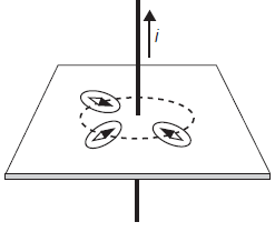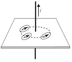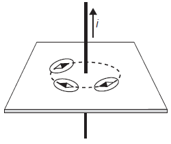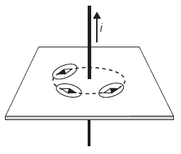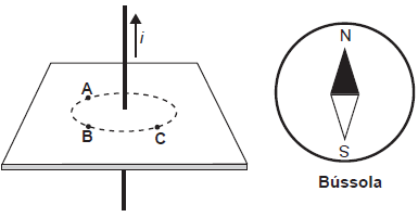 O físico Hans C. Oersted observou que um fio transportando corrente elétrica produz um campo magnético. A presença do campo magnético foi verificada ao aproximar uma bússola de um fio conduzindo corrente elétrica. A figura ilustra um fio percorrido por uma corrente elétrica i, constante e com sentido para cima. Os pontos A, B e C estão num plano transversal e equidistantes do fio. Em cada ponto foi colocada uma bússola.
