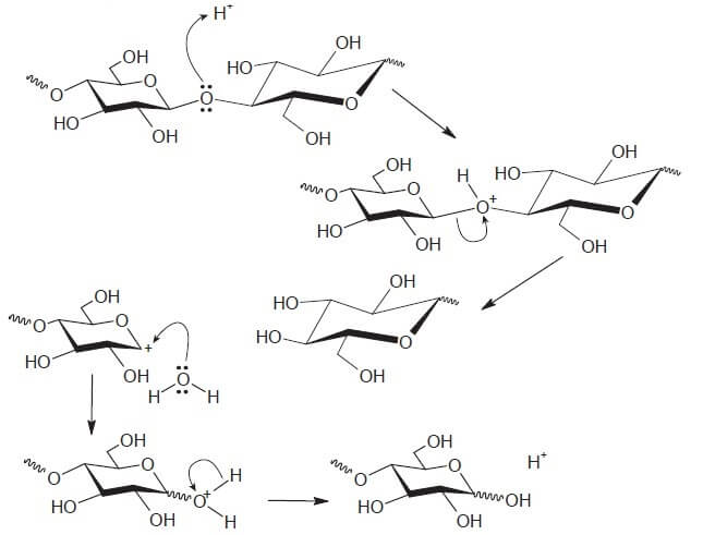 A biomassa celulósica pode ser utilizada para a produção de etanol de segunda geração. Entretanto, é necessário que os polissacarídeos sejam convertidos em mono e dissacarídeos, processo que pode ser conduzido em meio, conforme mostra o esquema: