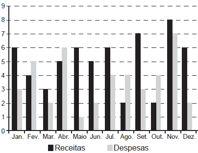 O gráfico apresenta os totais de receitas e despesas de uma empresa, expressos em milhão de reais, no decorrer dos meses de um determinado ano. A empresa obtém lucro quando a diferença entre receita e despesa é Positiva e tem prejuízo quando essa diferença é negativa.