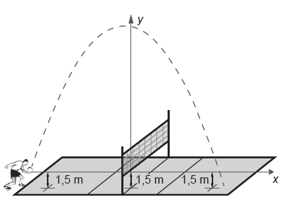 Em jogos de voleibol, um saque é invalidado se a bola atingir o teto do ginásio onde ocorre o jogo. Um jogador de uma equipe tem um saque que atinge uma grande altura. Seu recorde foi quando a batida do saque se iniciou a uma altura de 1,5 m do piso da quadra, e a trajetória da bola foi descrita pela parábola $y = - \frac{x^2}{6} - \frac{7x}{3} + 12$ em que y representa a altura da bola em relação ao eixo x (das abscissas) que está localizado a 1,5 m do piso da quadra, como representado na figura. Suponha que em todas as partidas algum saque desse jogador atinja a mesma altura do seu recorde.