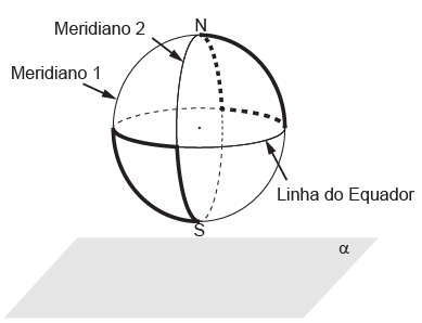 Na figura estão destacadas duas trajetórias sobre a superfície do globo terrestre, descritas ao se percorrer parte dos meridianos 1, 2 e da Linha do Equador, sendo que os meridianos 1 e 2 estão contidos em planos perpendiculares entre si. O plano α é paralelo ao que contém a Linha do Equador.