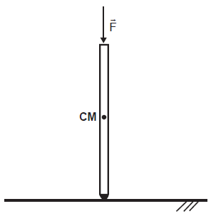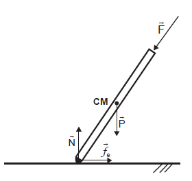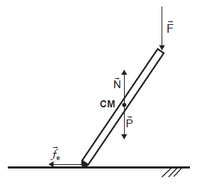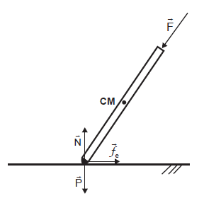 Tribologia é o estudo da interação entre duas superfícies em contato, como desgaste e atrito, sendo de extrema importância na avaliação de diferentes produtos e de bens de consumo em geral. Para testar a conformidade de uma muleta, realiza-se um ensaio tribológico, pressionando-a verticalmente contra o piso com uma força $\overrightarrow{F}$, conforme ilustra a imagem, em que CM representa o centro de massa da muleta.