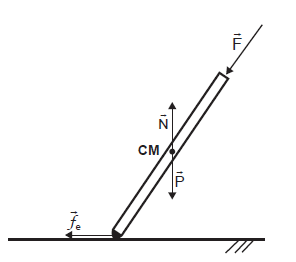 Mantendo-se a força $\overrightarrow{F}$ paralela à muleta, varia-se lentamente o ângulo entre a muleta e a vertical, até o máximo ângulo imediatamente anterior ao de escorregamento, denominado ângulo crítico. Esse ângulo também pode ser calculado a partir da identificação dos pontos de aplicação, da direção e do sentido das forças peso ($\overrightarrow{P}$), normal ($\overrightarrow{N}$) e de atrito estático ($\overrightarrow{f_e}$).
