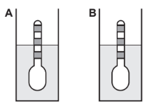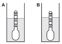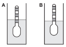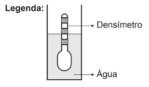 Usando um densímetro cuja menor divisão da escala, isto é, a diferença entre duas marcações consecutivas, é de 5,0 x 10-2 g cm-3, um estudante realizou um teste de densidade: colocou este instrumento na água pura e observou que ele atingiu o repouso na posição mostrada.