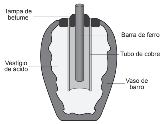 Em 1938 o arqueólogo alemão Wilhelm Konig, diretor do Museu Nacional do Iraque, encontrou um objeto estranho na coleção da instituição, que poderia ter sido usado como uma pilha, similar às utilizadas em nossos dias. A suposta pilha, datada de cerca de 200 a.C., é constituída de um pequeno vaso de barro (argila) no qual foram instalados um tubo de cobre, uma barra de ferro (aparentemente corroída por ácido) e uma tampa de betume (asfalto), conforme ilustrado. Considere os potenciais-padrão de redução: $ E^{\Theta} $ (Fe2+|Fe) = -0,44 V; $ E^{\Theta} $ (H+|H2) = 0,00 V; e $ E^{\Theta} $ (Cu2+|Cu) = +0,34 V.