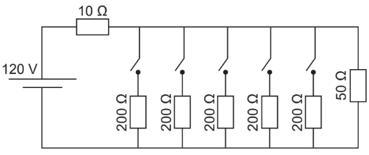 Uma casa tem um cabo elétrico mal dimensionado, de resistência igual a 10 Ω, que a conecta à rede elétrica de 120 V. Nessa casa, cinco lâmpadas, de resistência igual a 200 Ω, estão conectadas ao mesmo circuito que uma televisão de resistência igual a 50 Ω, conforme ilustrado no esquema. A televisão funciona apenas com tensão entre 90 V e 130 V.