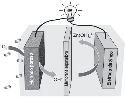Grupos de pesquisa em todo o mundo vêm buscando soluções inovadoras, visando a produção de dispositivos para a geração de energia elétrica. Dentre eles, pode-se destacar as baterias de zinco-ar, que combinam o oxigênio atmosférico e o metal zinco em um eletrólito aquoso de caráter alcalino. O esquema de funcionamento da bateria zinco-ar está apresentado na figura.