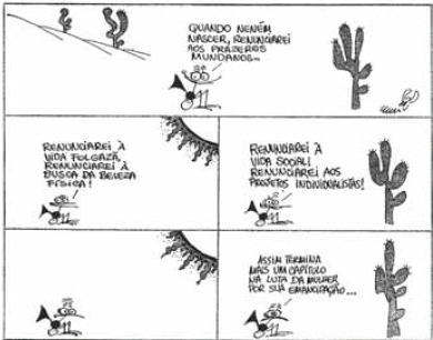 Nessa tirinha, produzida na década de 1970, os recursos verbais e não verbais sinalizam a finalidade de