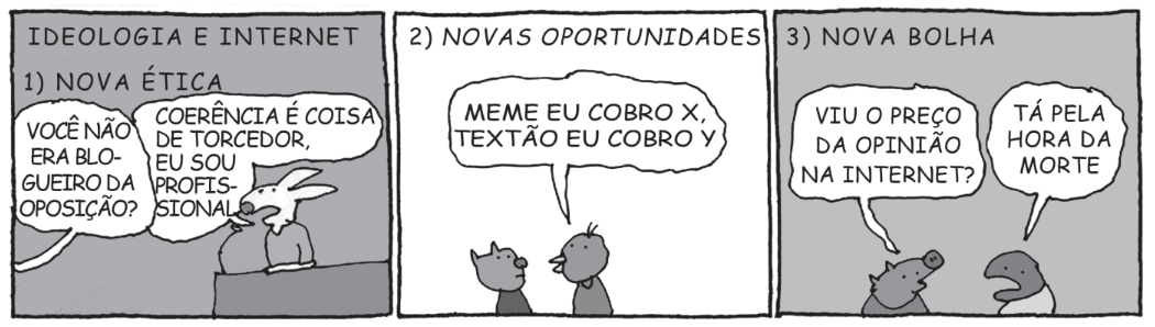 A internet proporcionou o surgimento de novos paradigmas sociais e impulsionou a modificação de outros já estabelecidos nas esferas da comunicação e da informação. A principal consequência criticada na tirinha sobre esse processo é a